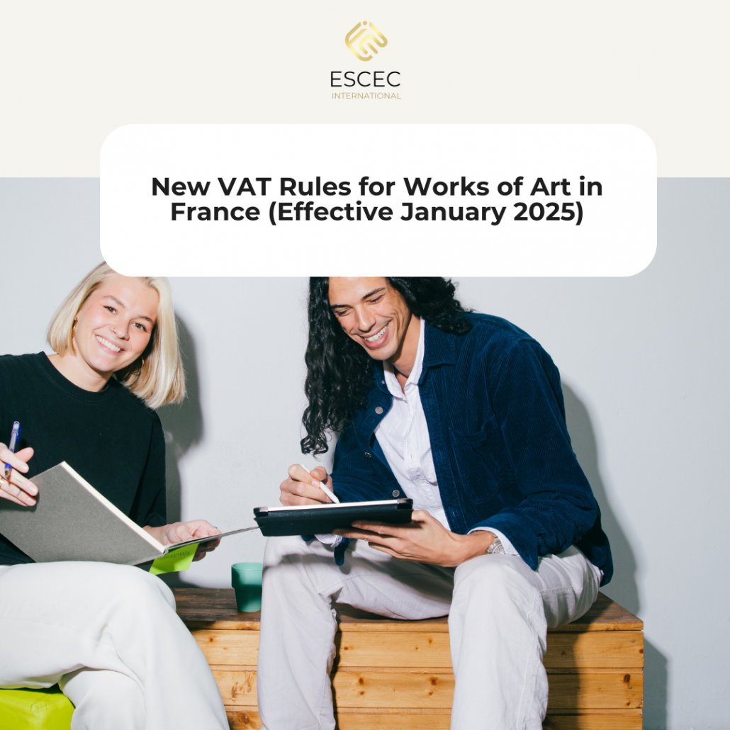 At ESCEC International, we help galleries, art dealers, and international entrepreneurs navigate French VAT ruleswith clarity and confidence. Contact us today to ensure full compliance and strategic positioning under the new system.